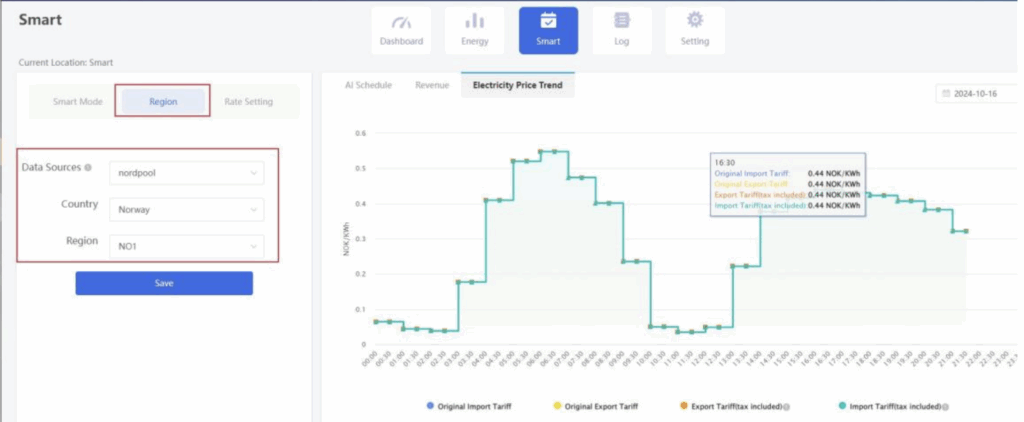 Selecteer de regio als gegevensbron voor dynamische elektriciteitsprijzen. Nadat de configuratie is voltooid, kan de slimme planning worden uitgevoerd. De