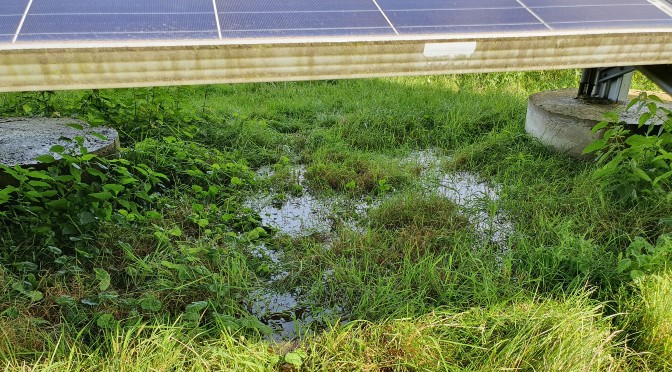 Door kleine hoogteverschillen in de bodem stroomt water, vooral op kleigrond, ook zijwaarts. Hier staan forse plassen onder de panelen, een dag of 3 na de regen.