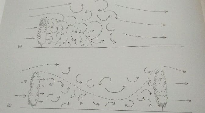 De tuin is zo’n 26 meter breed. Dus als we wind een beetje schuin op de tuin komt zal deze maximaal zo’n 30 meter afleggen tot de noordkant. Daar staan bomen en struiken van de buren. Een windsingel zal de wind met 50% verminderen in een gebied 7 tot 8 keer de hoogte van de singel. Hij moet dus ongeveer 4 meter hoog worden als we verder geen bomen planten (a). Maar struiken en bomen verderop zullen de luwte verlengen (b).