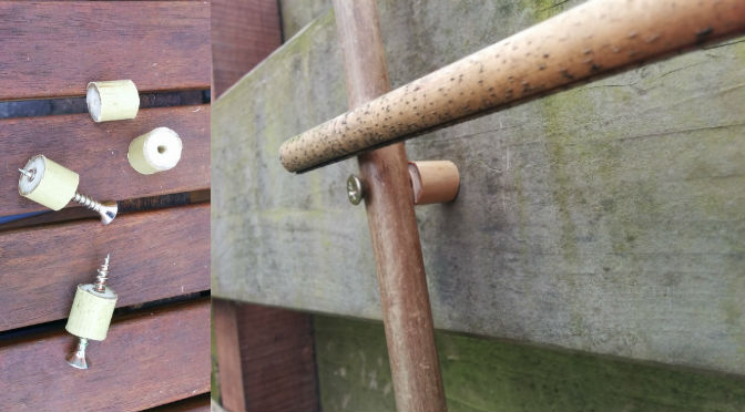 Om mijn clematis wat extra ruimte te geven om tussen het trellisscherm en de schutting door te groeien zonder bekneld te raken, wil ik het scherm niet rechtstreeks in het hout van de schutting schroeven. De oplossing is eenvoudig. Je zaagt van een restje bamboe vier stukjes van bijvoorbeeld 1,5 centimeter (check even de lengte van je schroeven). Bamboe is hol en vormt dus een mooi buisje om de schroeven aan het oog te onttrekken.